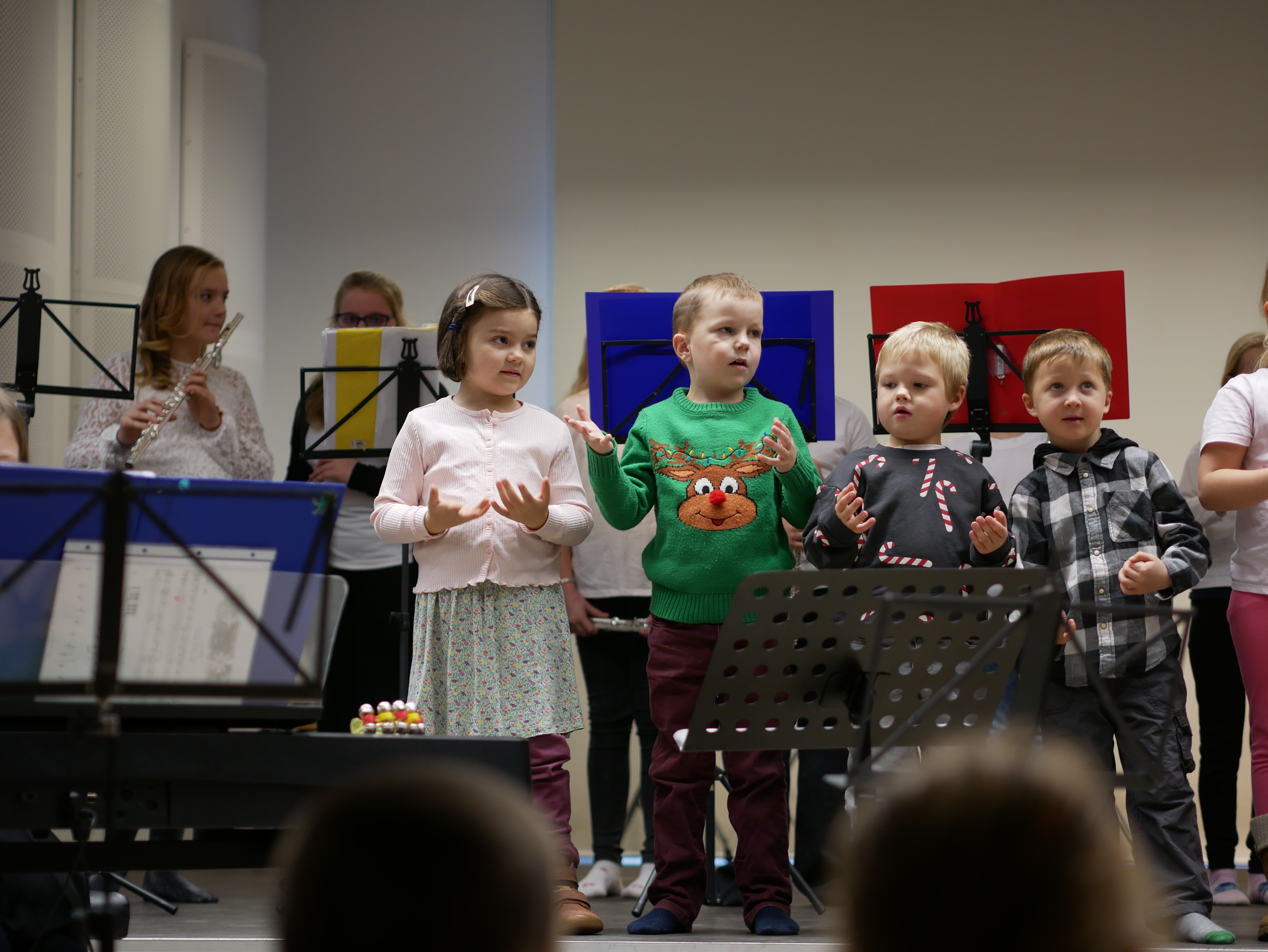 Gerade für Kinder sind Auftritte von großer Bedeutung – all die Gefühle im Vorfeld und im Nachhinein gehören zu einer gelungenen Darbietung dazu. Das Publikum durfte sich über vielseitige und musikalisch ansprechende Beiträge freuen. Beim letzten Stück des offiziellen Programms, der bekannten Nummer „Last Christmas“, hätte das Publikum am liebsten gleich mitgesungen. Und wie es sich für ein musikalisches Publikum gehört, wurde zum Abschluss gemeinsam mit Schüler:innen und Lehrer:innen das Lied „O du fröhliche“ angestimmt.